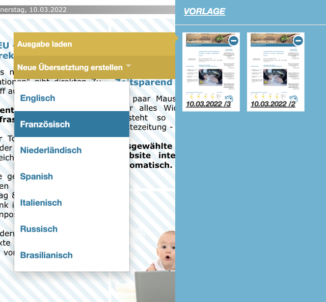 Wählen Sie im Menü unter „Meine Ausgaben“ die Ausgabe des Tages, an dem Sie eine Übersetzung erstellen möchten.