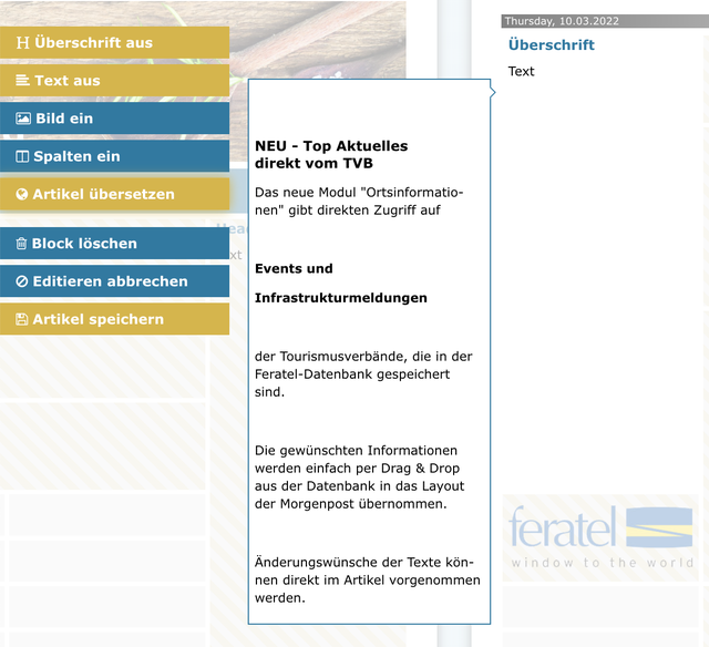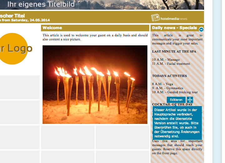 - Zeitungstitel – für die jeweilige Sprachausgabe definieren; klicken Sie auf „bearbeiten“ im Titelbild, überschreiben Sie den bestehenden Tiel und speichern Sie.