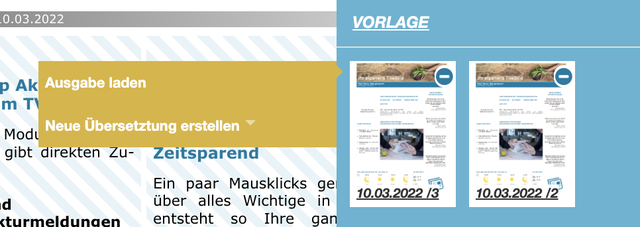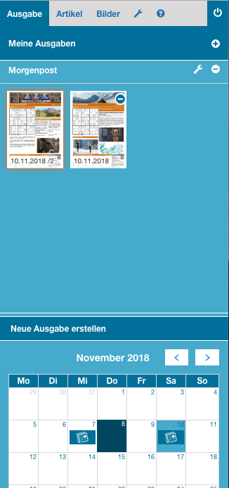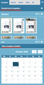 Gespeicherte Ausgaben werden als Icon der Titelseite mit dem jeweiligen Datum der Ausgabe dargestellt. Hat man an einem Tag mehrere Ausgaben erstellt, erscheint nach dem Datum eine fortlaufende Zahl.
